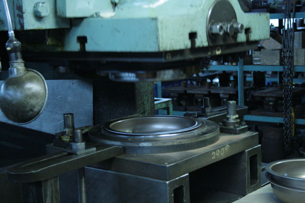 | | 絞り(成形) | | (1) 金型にて、本体の成形をします。 ・平らな板を、絞り上げて器状にします。 (2) ・まず円盤上の材料を金型の上に置きます。 (3) ・上型が下りてきて、絞り工程開始